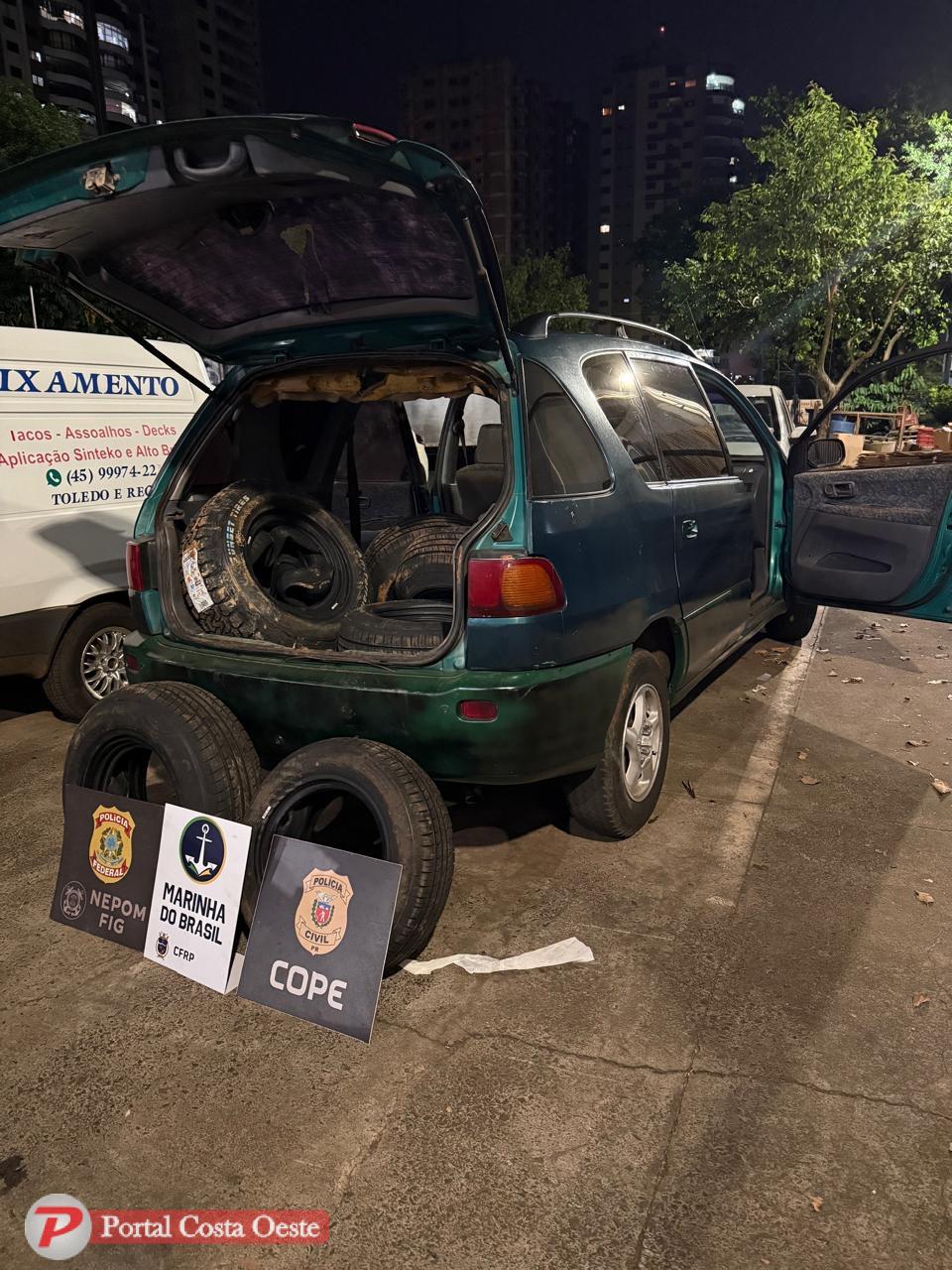 Ação conjunta da PF, PC e Marinha resulta na apreensão de veículo carregado com pneus contrabandeados